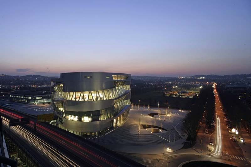 To reach the origins of the automobile, you have to go right to the top. The exhibition in the Mercedes-Benz Museum starts on the ninth floor. From here, visitors make their way in wide curves down two circular routes through automotive history – from 1886 up to the present day. The Mercedes-Benz Museum, which opened in 2006, is Stuttgart's most visited museum, with about 700 000 visitors annually. The futuristic architecture was designed by the UNStudio van Berkel & Bos, Amsterdam. The building is modelled on the double helix of a DNA spiral. In its interior, on an area of