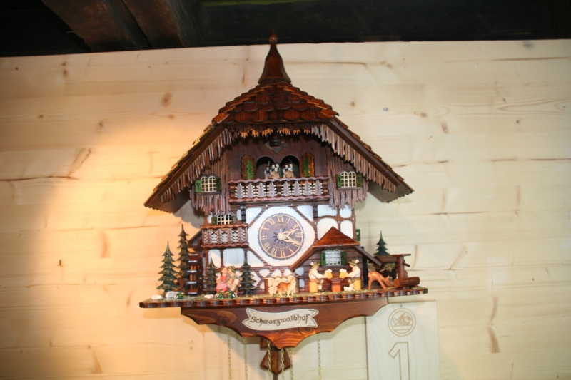 The first cuckoo clock was invented in the Black Forest somewhere in the first half of the 18th century. Till this day it is traditionally manufactured here. In the course of the years many variations of cuckoo clocks have developed. From a simple wooden implementation with a little door from where at each full hour the cuckoo calls, to luxuriously formed, colourful and carved watches in which figures turn around, there is today a broad spectrum of cuckoo clocks. Since a couple of years there even are models made of plastic instead of wood.