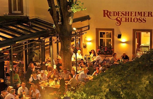 This Wine Restaurant with its “gemutlich” atmosphere is situated right at “Drosselgasse” and attracts with its sunny winter garden and its romantic “castle garden”. It offers regional dishes and the owners self-grown wines, mostly Riesling and Pinot Noir. Guests prefer the Riesling-Cheese-Soup and Duck à la Castle.