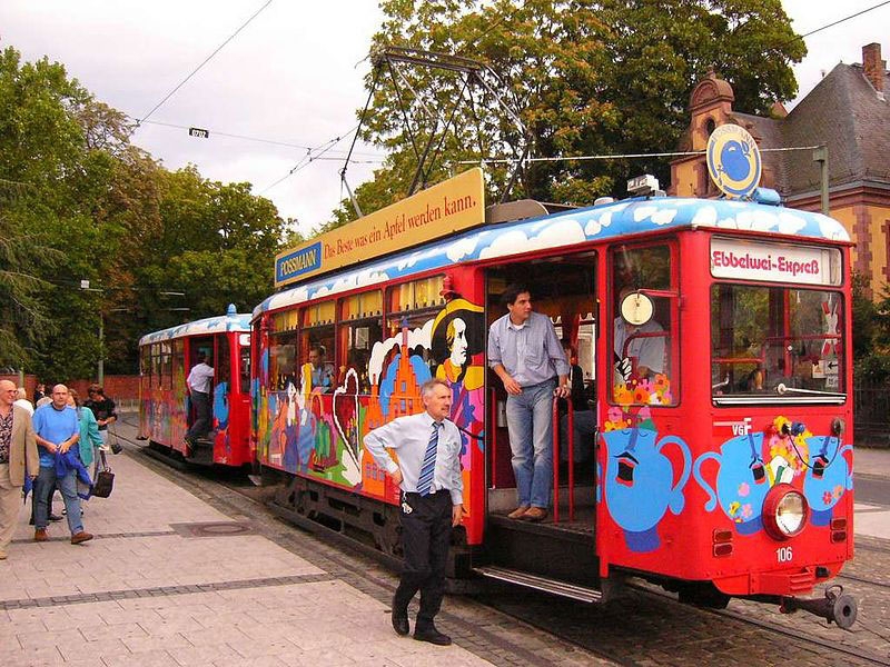 When visiting Frankfurt you should take a tour of a very special kind: the „Ebbelwoi express train“! Throughout the year this multi-coloured streetcar goes with music, pretzels and "Ebbelwoi", which is the Hessian word for cider, through Sachsenhausen and Frankfurt‘s Old Town and passing numerous places of interest. On Saturdays, Sundays and holidays hop on hop off is possible at all Ebbelwoi express train stops.