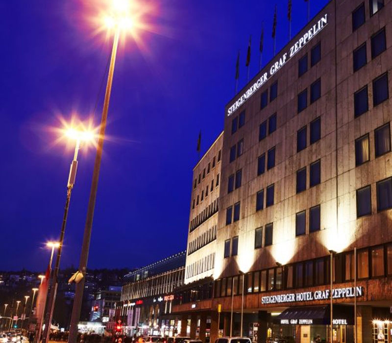 Located vis-a-vis the Stuttgart main train station the Steigenberger Graf Zeppelin welcomes its guests to enjoy the short ways to attractions like the Palace Square (Schlossplatz, 900 meters) or the Opera Building (Opernhaus, 800 meters). Stuttgart Airport is 14.5 km away. A total of 117 rooms and 38 suites are very comfortable due to noise insulated windows. They offer flatscreen TV, air conditioning, desk, safe and minibar.
