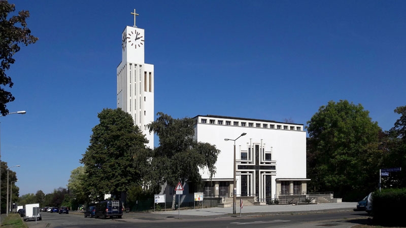 The Church of Reconciliation (Versöhnungskirche) sitting in Leipzig-Gohlis is one of the few examples of modernist church architecture in Germany. The reinforced concrete skeleton was built in a consciously modern style. The architect placed particular emphasis on the vertical by incorporating edges on the body and openings in the walls. The church’s entrance area is dominated by a cross window made of concrete with coloured panes of glass, which forms the main feature of the building. Its interior is strikingly clear structured and modest, typical of the Bauhaus. The Church of Reconciliation is located in the immediate vicinity of the stylistically similar Kroch estate.